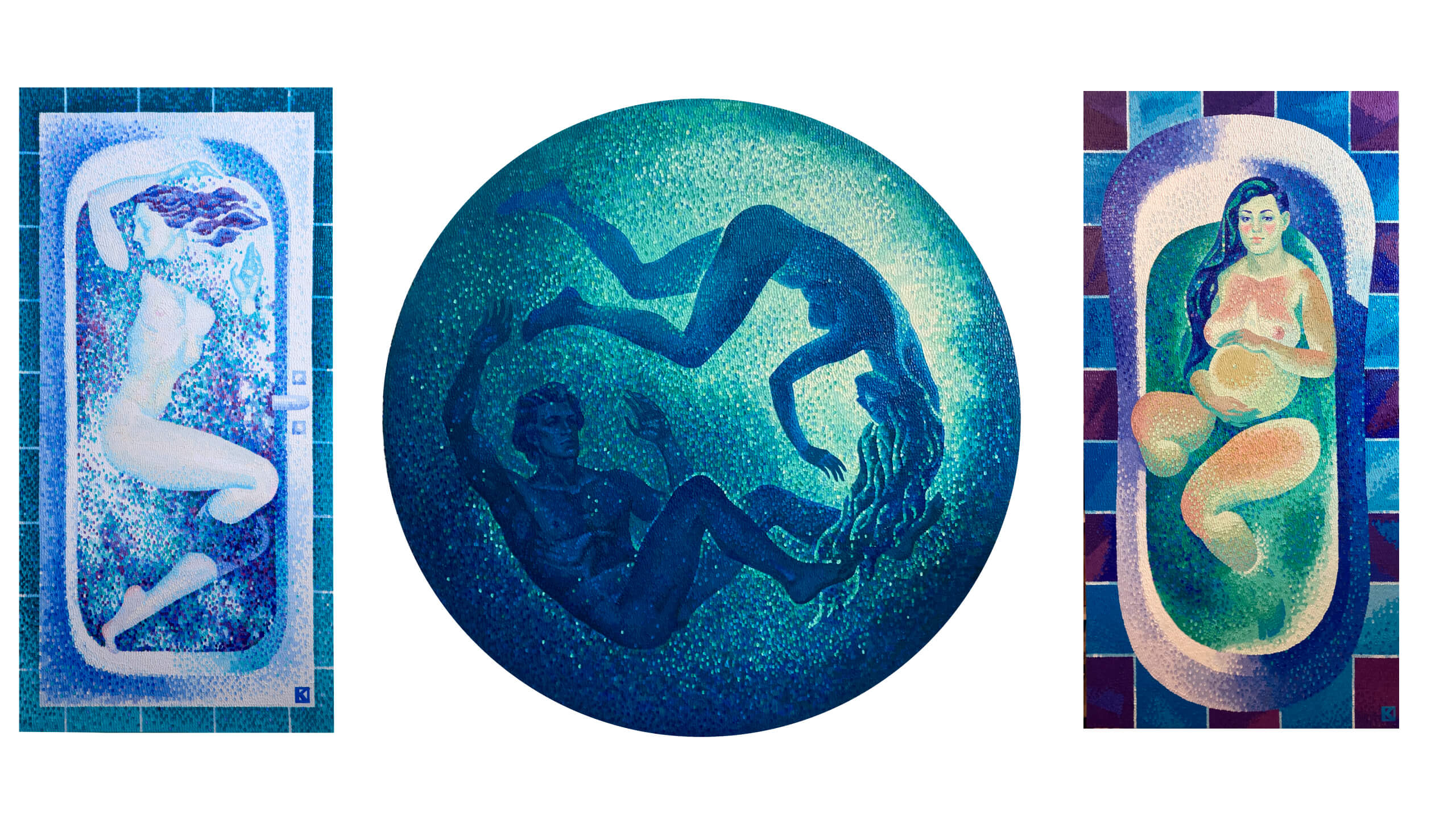 Il pannello sinistro del trittico "Eterna Femminilità". Le eroine di tutte e tre le parti sono immerse nell'acqua, che si tratti del mare o di un bagno. Fin dall'alba della vita, tutti gli esseri viventi sono indissolubilmente legati all'acqua. Pertanto, quando parlo di femminilità, traccio un parallelo tra la donna e l'elemento acqua, senza il quale, come senza la donna, non ci sarebbe la vita in quanto tale... La prima eroina è l'immagine di una vergine, una ragazza ancora giovane, ancora in attesa di rivelare la sua femminilità. È bella, ma non ha ancora la dolcezza e la tenerezza che sbocciano in una ragazza quando diventa una vera donna.
