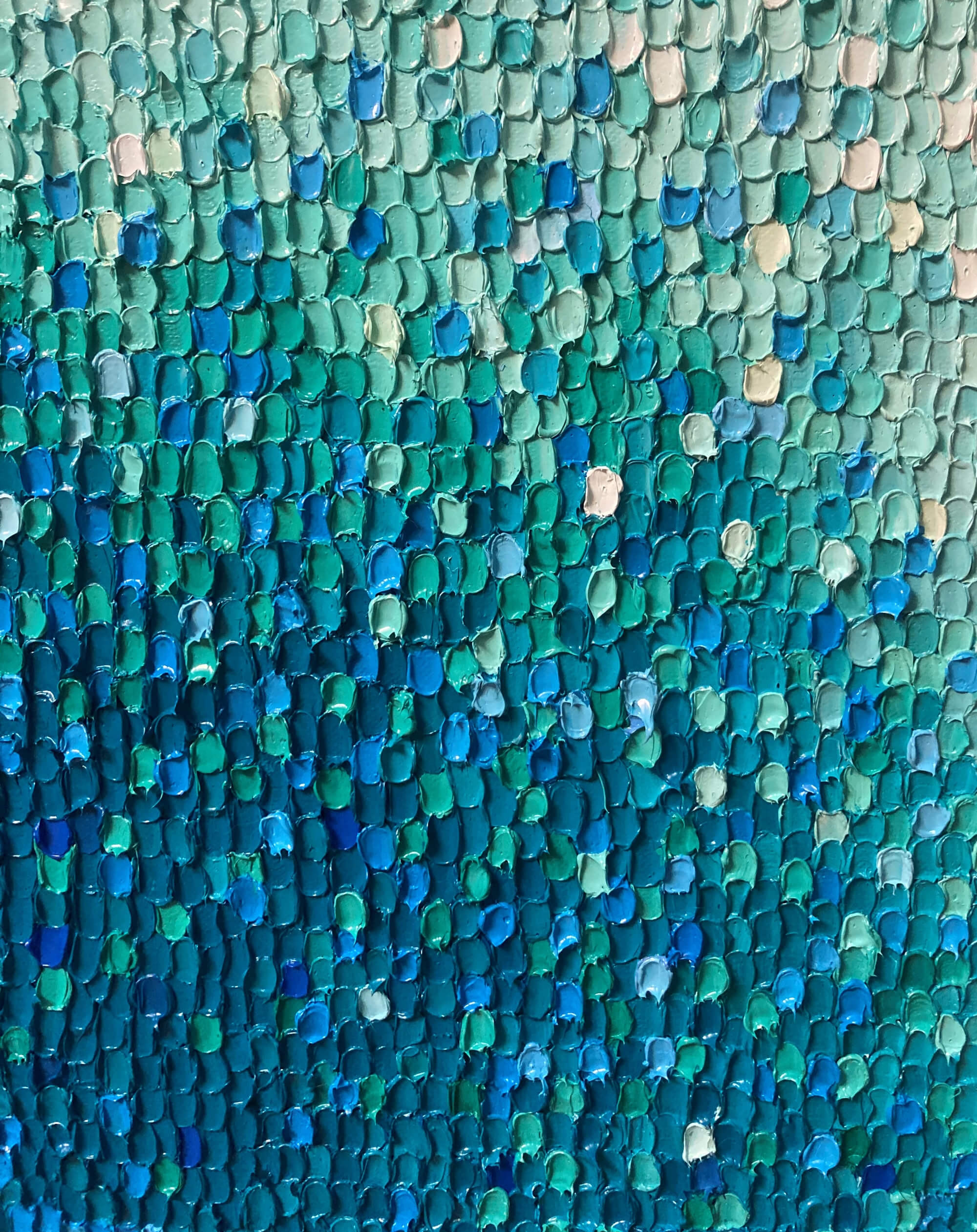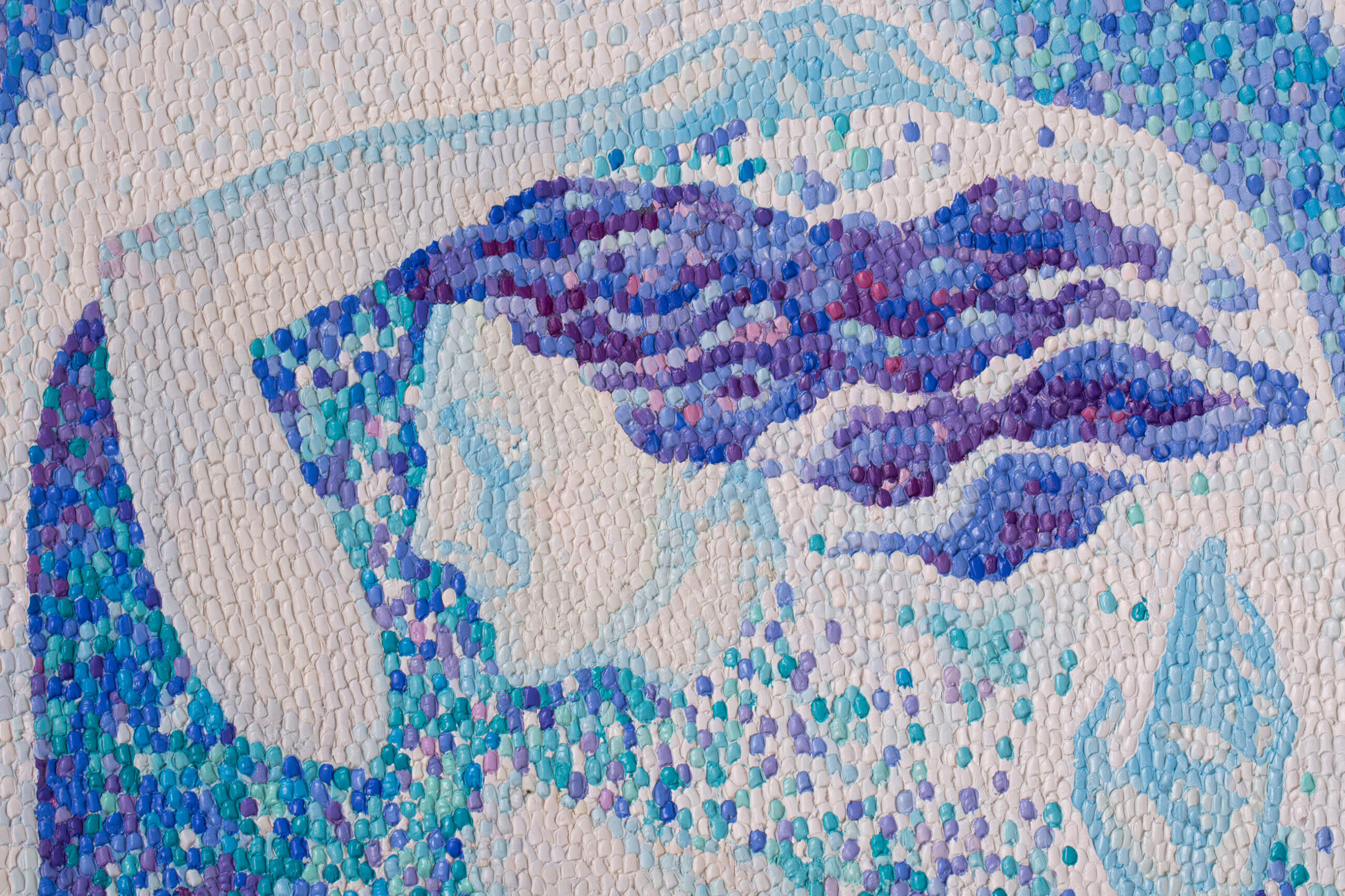 Il progetto “Particella/Pixel” esplora la relazione tra il mondo reale e quello digitale, guardandoli attraverso la lente della decostruzione e della ricostruzione della forma. Il lavoro del progetto si concentra su punti, tramiti tra particelle del mondo fisico e pixel dell'ambiente digitale, che fungono da elementi costitutivi di queste due realtà. Un pixel diventa un analogo di una particella, un'unità quantistica in una simulazione digitale del mondo reale. Applico tecniche di puntinismo (o divisionismo) basate sull'applicazione spot delle vernici. Questo metodo enfatizza l'interazione tra realtà fisiche e digitali. In una parte del lavoro sui pixel, uso colori acrilici fluorescenti che, sotto la luce UV, creano un effetto bagliore. Ciò rafforza il senso di simulazione del mondo digitale e sottolinea il passaggio da più punti a forme riconoscibili